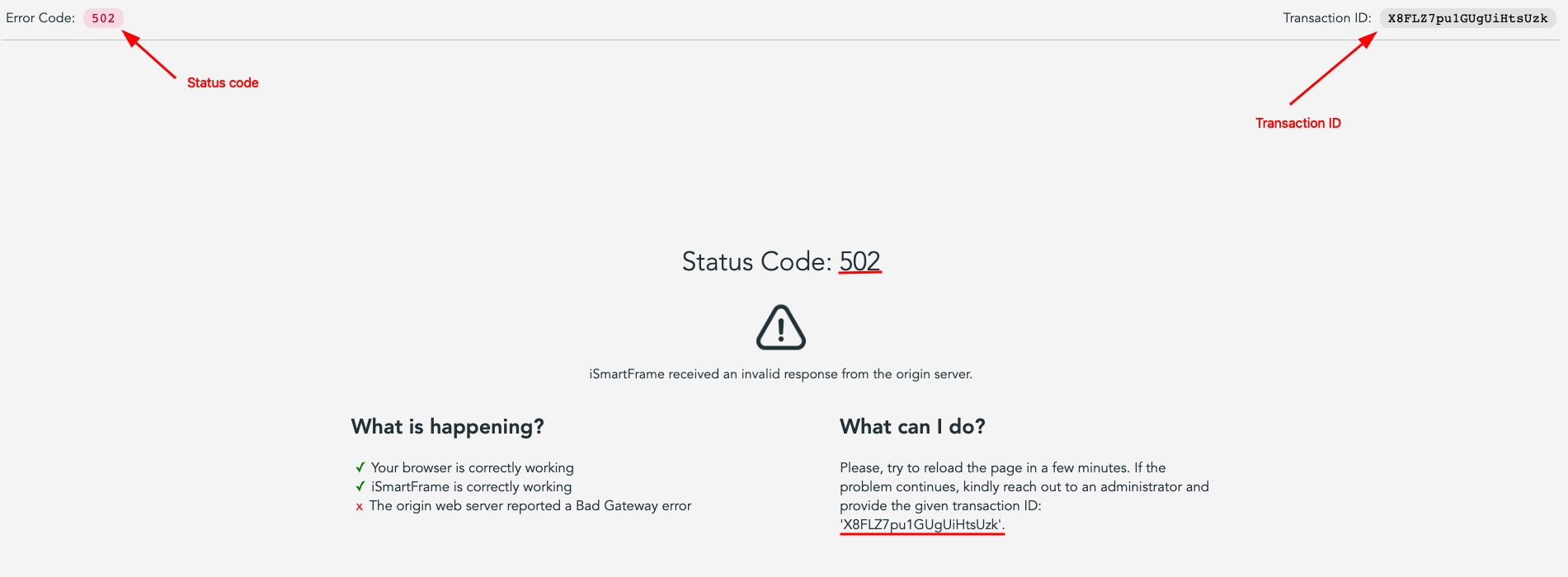 Error/status code: questo codice è la risposta HTTP dal server di origine che il tuo sito web ha inviato quando iSmartFrame ha cercato di connettersi e servire la pagina all'utente. Ogni codice è spiegato dettagliatamente nella parte centrale della pagina. Esempi di codici di stato sono: